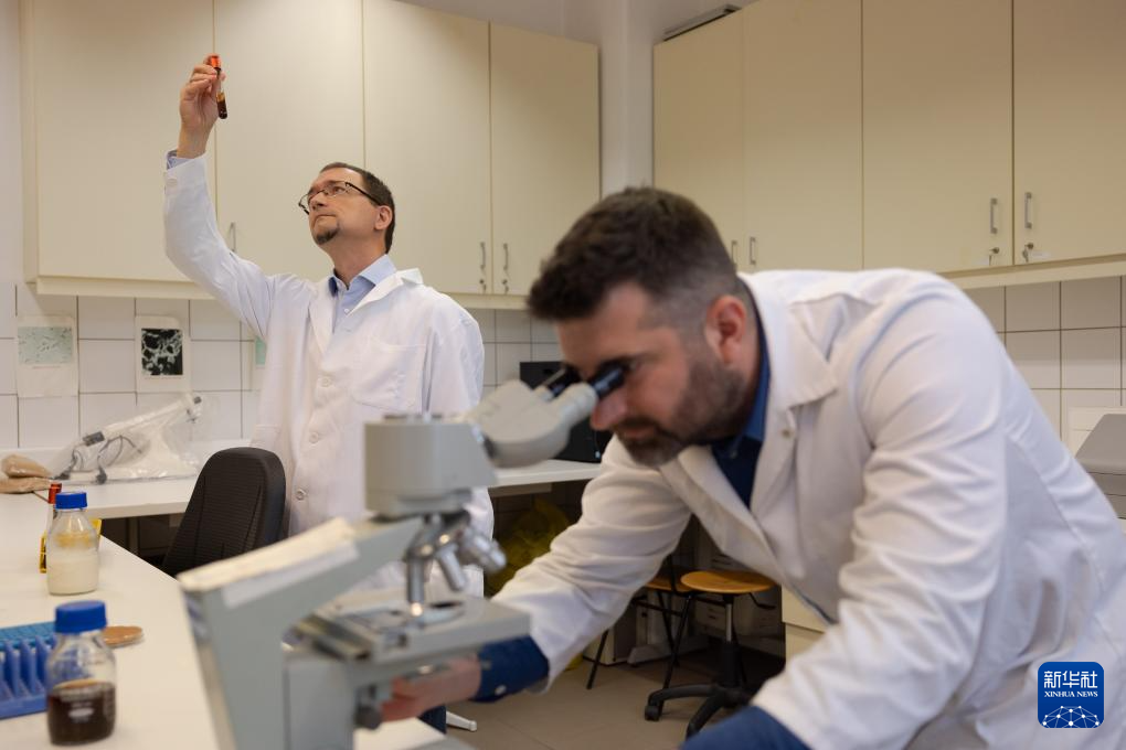 5月27日,在匈牙利布达佩斯,匈牙利农业与生命科学大学研究员海吉·费伦茨(前)、佐兰·若尔特在实验室工作。 新华社发(弗尔季·奥蒂洛摄)